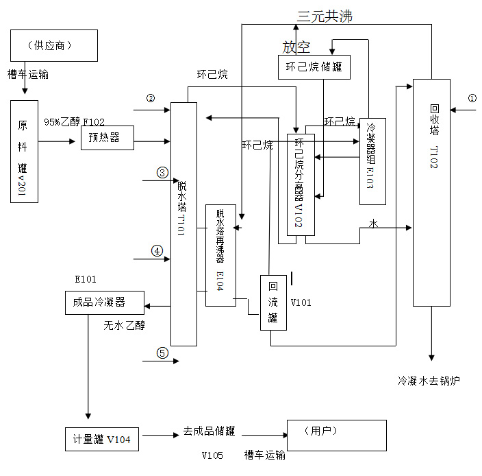 濃度為95%(體積比)的乙醇溶液經(jīng)預(yù)熱后,直接進(jìn)入脫水塔中上部,溫度控制在73℃—74℃,脫水塔頂溫控制在66℃—68℃,入塔后與從塔頂進(jìn)入的環(huán)己烷在塔內(nèi)形成三元共沸物,并以氣相形式從脫水塔頂部進(jìn)入環(huán)己烷分離器,在分離器及冷凝器組內(nèi)冷凝。冷凝后的液體在分離器內(nèi)分成上下兩層。富含環(huán)己烷的上層通過富環(huán)己烷泵回流入脫水塔;富含水的下層通過富水泵送入回收塔的中下部,富水相中的乙醇、環(huán)己烷在回收塔內(nèi)被進(jìn)一步分離濃縮,然后也以三元共沸物的形式從回收塔頂部(溫度控制在110℃ —112℃)出來再通過脫水塔再沸器,大部分蒸汽在脫水塔再沸器內(nèi)被冷凝,冷凝液回流入回收塔頂,少部分沒有被冷凝的乙醇和環(huán)己烷氣體直接進(jìn)入冷凝器組進(jìn)行冷凝,冷凝液進(jìn)入環(huán)己烷分離器進(jìn)行分層,從而達(dá)到回收下層富含水相中環(huán)己烷和乙醇的目的。脫水后的無水乙醇從脫水塔底部導(dǎo)出,而脫出的少量水則從回收塔底部排出系統(tǒng)外。生產(chǎn)過程中損失的環(huán)己烷可通過環(huán)己烷分離器進(jìn)行補(bǔ)充。